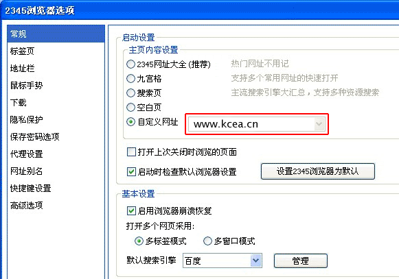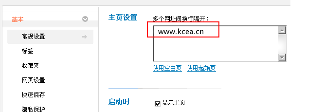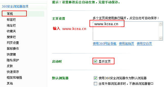 2)然后在打开的对话窗口中的主页设置的地址输入框中输入“http://www.kcea.cn/”设置修改后会自动生效,无需手动保存。如图所示: