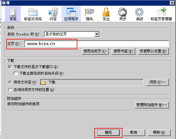 2)然后在打开的对话窗口中的主页设置的输入框中输入“http://www.kcea.cn/”即可