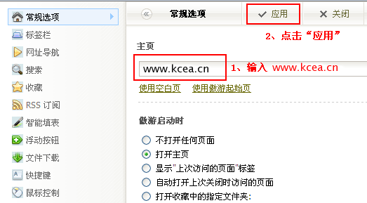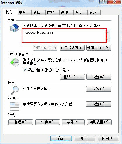 2)然后在打开的对话窗口中的主页栏的地址输入框中输入“http://www.kcea.cn/”,然后点击窗口上方的“应用”按扭即可,如下图所示:
