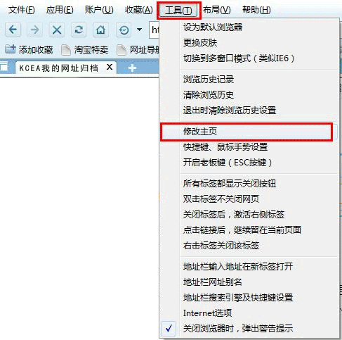 KR浏览器设置主页的方法: 1)首先,打开浏览器上部菜单栏的“工具”栏,在下拉列表中选择“修改主页”,如下图所示: