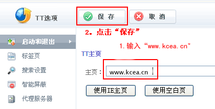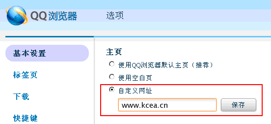 2)然后在打开的对话窗口中的主页栏的地址输入框中输入“http://www.kcea.cn/”,然后点击窗口上方的“保存”按扭即可,如图所示: