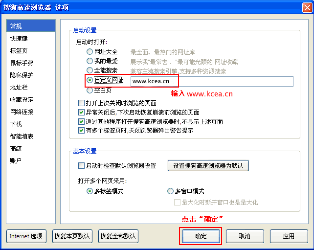 提示:若仍无法设置主页,请点击查看“主页修复”;或“把K C E A .C N 我的网址归档 上网首选导航 简洁 高效 快捷下载到桌面” 搜狗浏览器